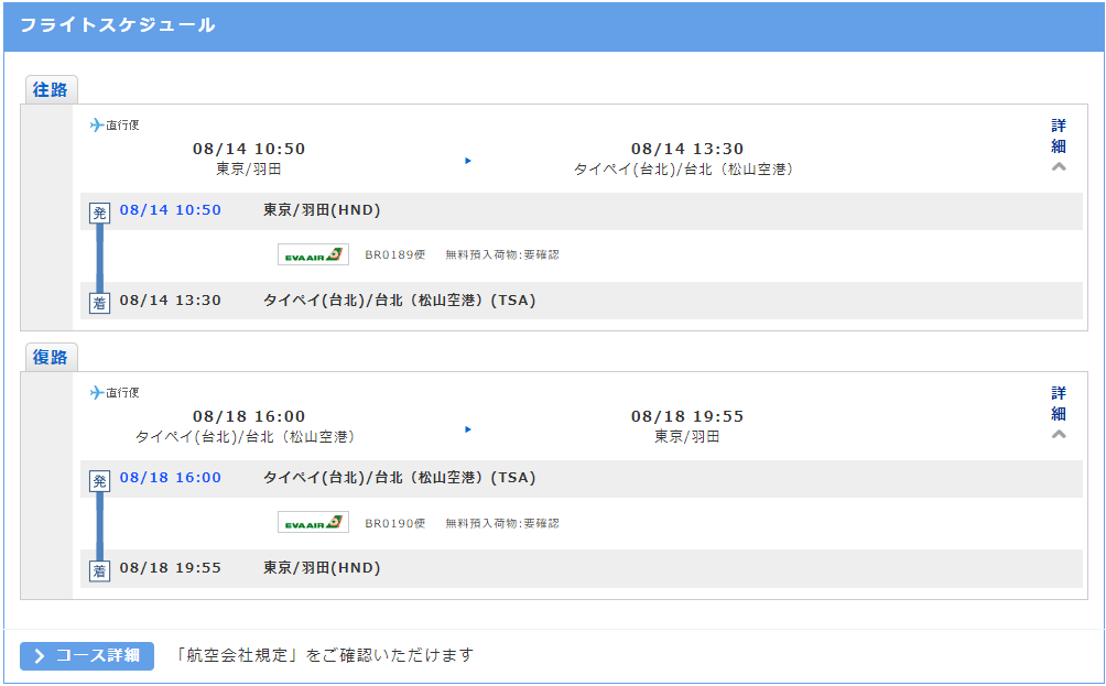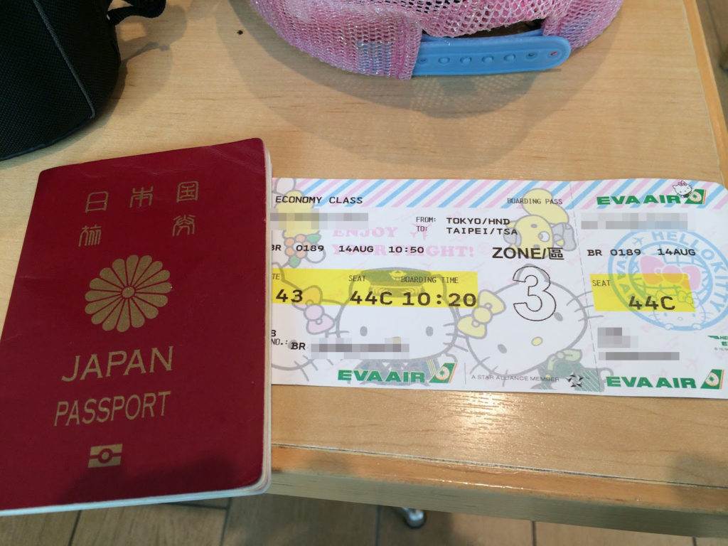 お次は渡航手配です。旅行会社は今回も私の定番、イーツアーさんを利用しました。航空会社は、娘が大好きなキティちゃんジェットのエバー航空です。羽田空港~台湾松山空港便で、往路は午前の便で現地にお昼過ぎ到着、復路は夕方の便で夜に日本到着する便を選びました。大人が1人あたり往復45,680円(航空券28,100円、航空保険料及び燃油12,600円、空港使用料2,670円、入出国管理税1,230円、手配料金1,080円)、子供が往復38,390円(航空券22,100円、航空保険料及び燃油12,600円、空港使用料1,380円、入出国管理税1,230円、手配料金1,080円)でした。