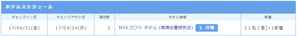 日程は2017年4月21日出発で24日に帰国するという3泊4日の旅で、航空券が3万円弱、ホテルが3泊で1.6万円、諸経費あわせて合計5万円です。
